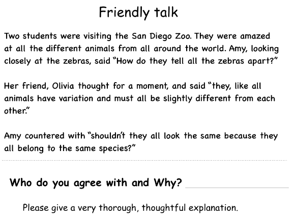Description: Students are given a real-life scenario in which friends talk about a concept or phenomenon. They are then asked to pick the person they most agree with and explain why. There is usually one best answer and the alternative provided is based on commonly held student misconceptions.